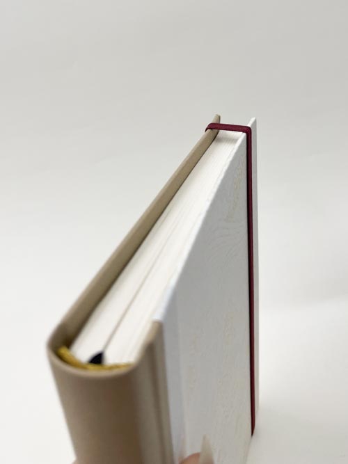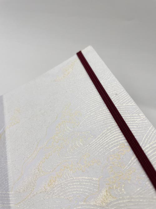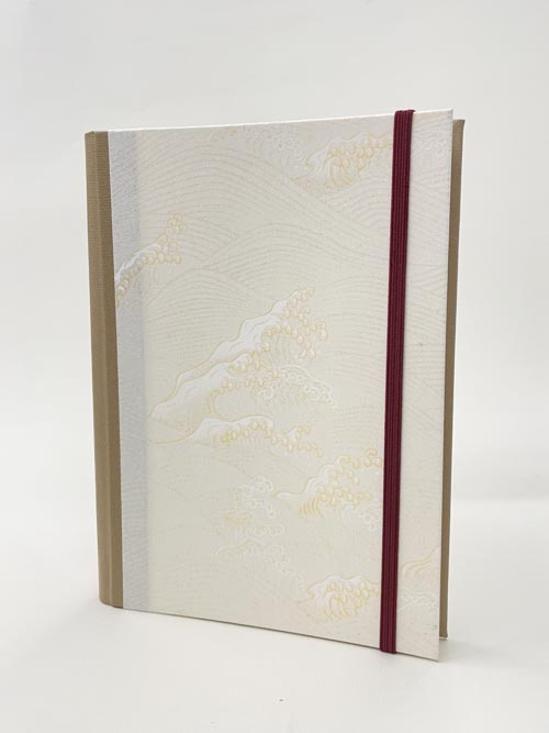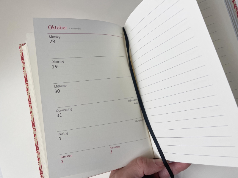 Dieser Kalender bietet eine Wochenansicht mit Platz für Notizen in jeder Woche, ein Leseband und einen dunkelroten Schließgummi. Das Buch ist am Rücken und auf dem Rückdeckel mit Buckram in Beige, einem robusten abwischbaren Gewebe bezogen. Auf dem Vorderdeckel schillert ein besonderes Japanpapier aus dem Siebdruckverfahren.